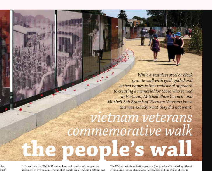 While a stainless steel or black granite wall with gold. Gilded and etched names is the traditional approach to creating a memorial for those who served in Vietnam; Mitchell Shire Council and Mitchell Sub Branch of Vietnam Veterans knew this was exactly what they did not want…….