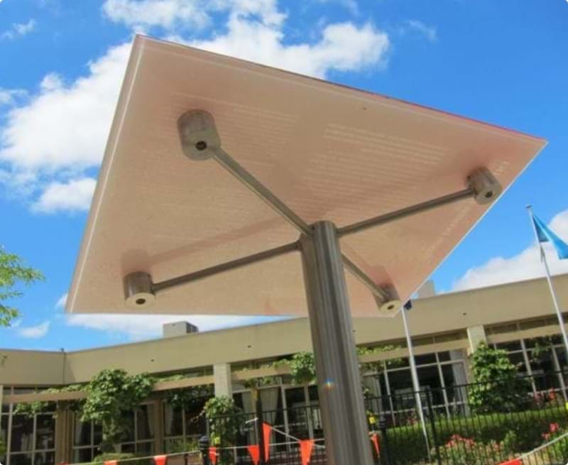 Feature glass petals stand colorful and a powerful story of the past residence of this once hostel. Led lighting illuminate the petals to create a wow factor at night. Curved seating curved around the petals. Synthetic grass and a new rose named after garden create spring/summer and autumn color with yellow daffodils giving a meadow of color in winter. Hundreds of Dutch buxus frame the teardrop shaped garden.