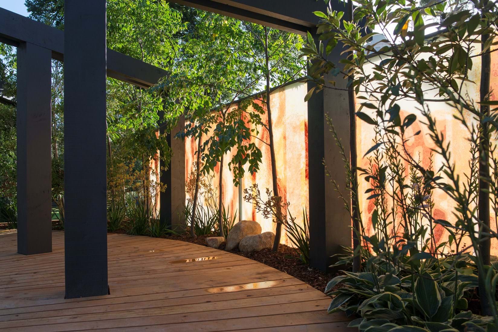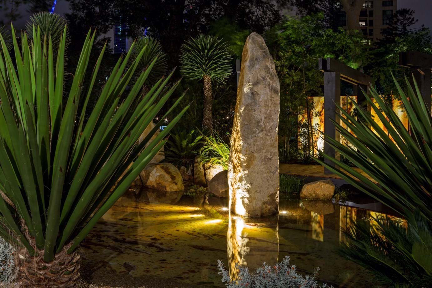 The cooling misting unit also provides a visual element to the landscape as well as cooling the space during hot weather. Sound in the landscape adds to the atmosphere whilst garden light creates a whole different mood and look to the landscape at night. The rear of the garden is formalized with an interporation of landscape printed on to a glass art panel which frames the show gardens backdrop.