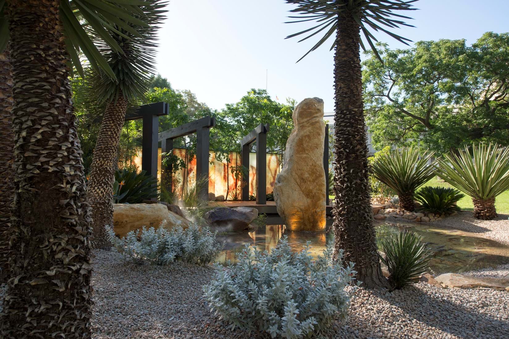 Our design is representative of a landscape that focuses on the centrally placed yellow granite boulder. The design line radiates out from the centre of the boulder to the indigenous glass art panels set within the water of the circular pond, semi circular deck and pergola providing relaxation place of visual interest Australian native and exotic planting set amongst these elements giving an arid planting feel to the outer perimeter of the landscape and merging into a more tropical lagoon planting theme closer to the water body.