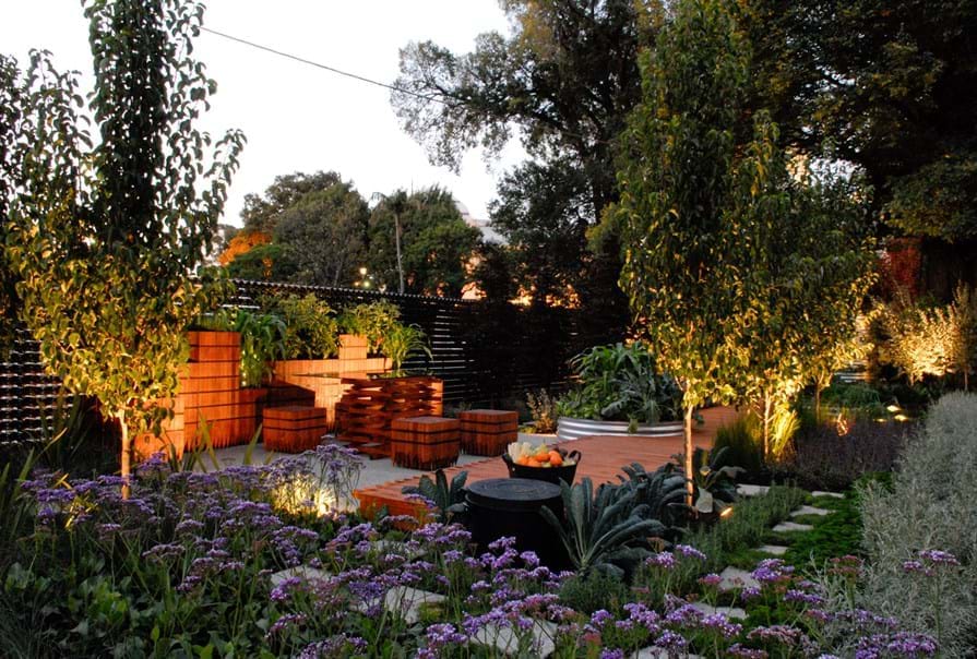 'Food for Thought' is an edible garden inspired by the pre-renaissance practice of combining food plants with ornamental plants as well as today's environmental challenges. The design is intended to appeal to environmentally conscious consumers, DIY types and children alike. The garden includes a used wine bottle wall, sustainable permeable paving made from resin bonded recycled crushed glass, an aquaponic system, a worm farm and on site water harvesting, storage and distribution via a permeable pavement, water tank and drip irrigation. Hardy ornamental plants adapted to Australia’s harsh climate, herbs and vegetable and fruit and shade trees make up the plant palette.