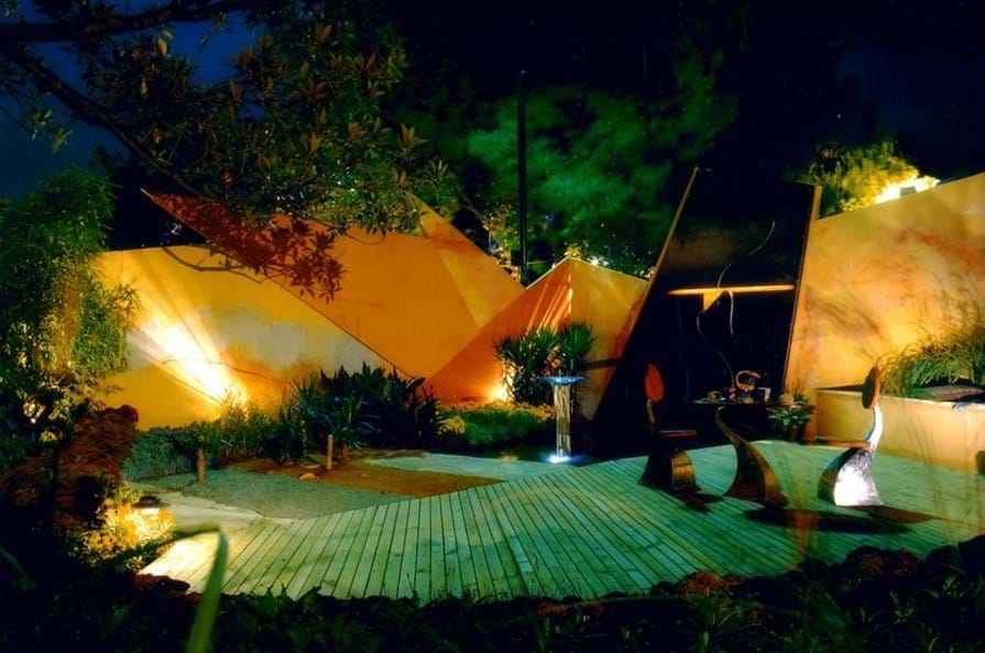 Balancing of the landscape with the use of geometric forms was intended to create strong sightlines and direct views across the landscape, rather than restrict and minimise views. The softness of concentric landscape “ripples” and reflections of light from galvanised steel and glass allowed viewers to look at a real solution to a typical inner city garden.
