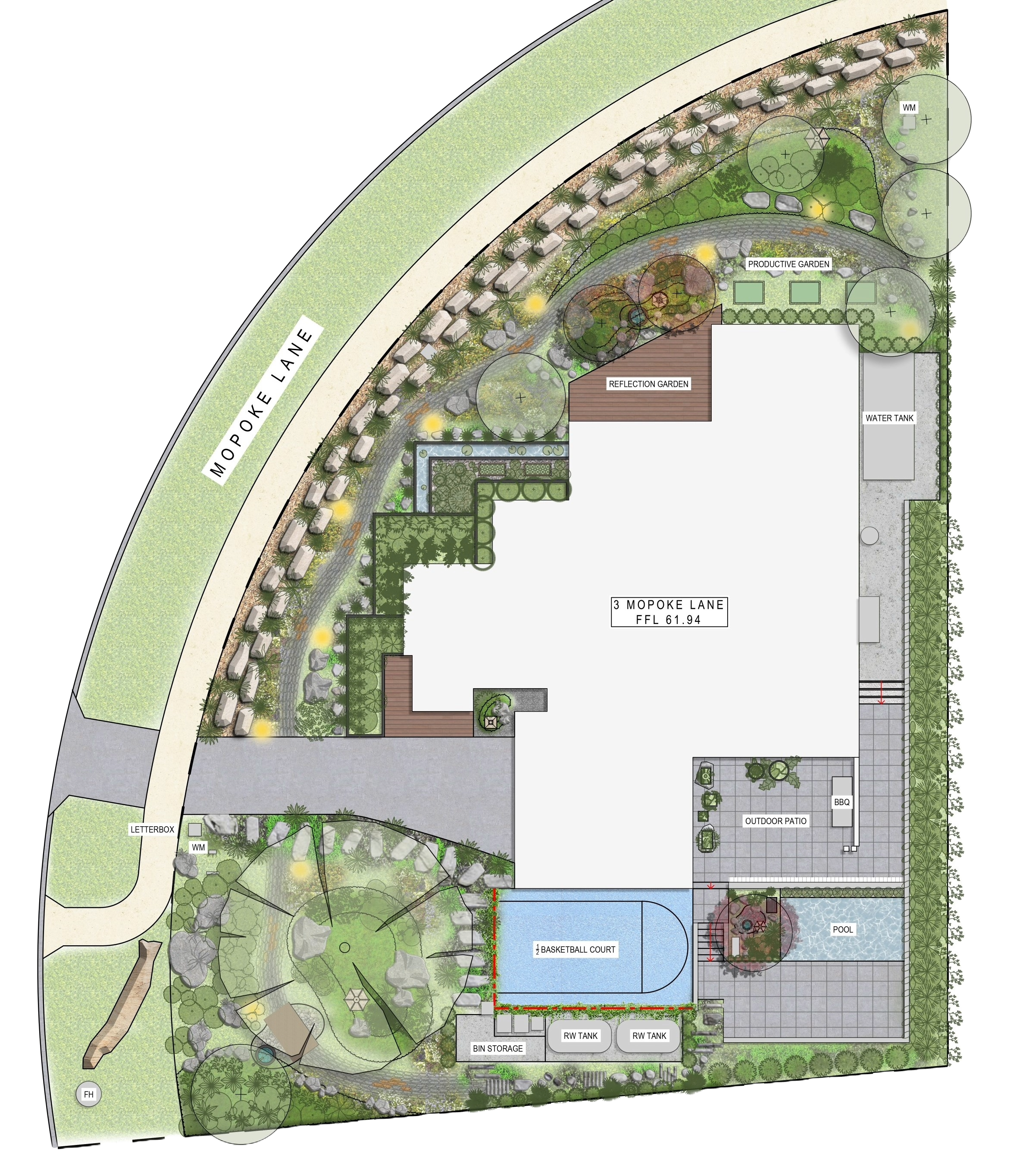 Concept plan for our Japanese Garden design in Donvale. Nestled in the outer eastern suburbs of Melbourne, with a picturesque view of Mullum Mullum Creek, our design beautifully combines traditional Japanese elements with native Australian flora.