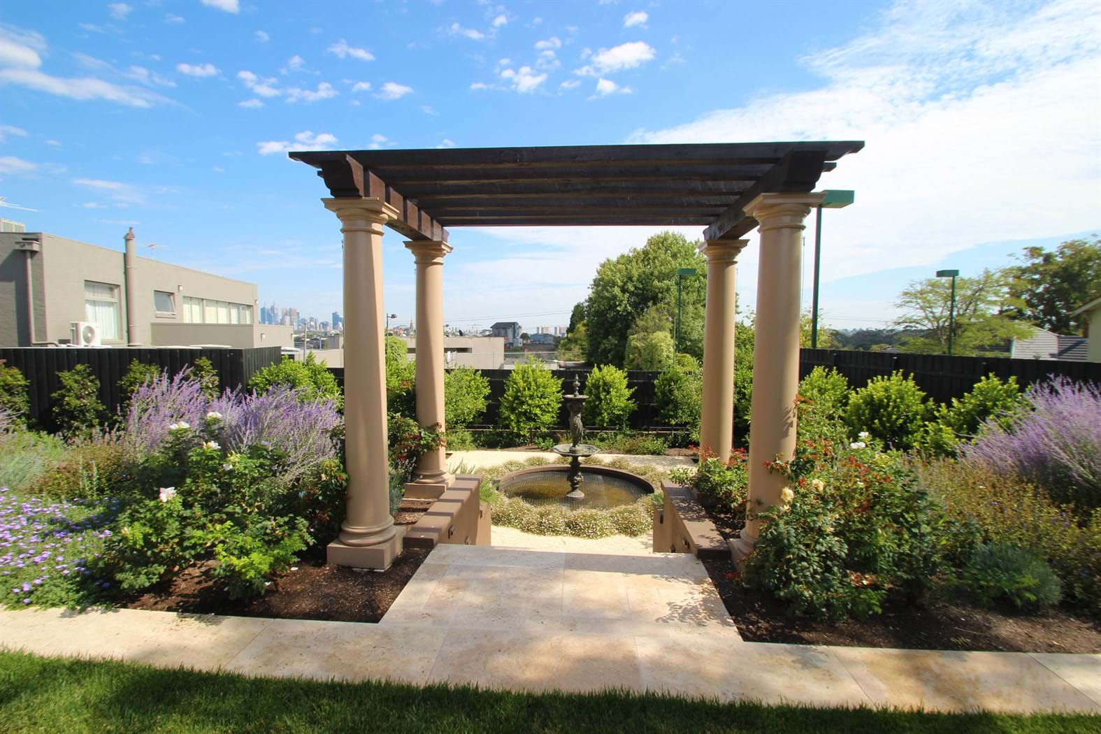 A combination of formal plantings and colourful perennial plants makes a stunning visual appeal for this European style garden. The planting palette complement the ageless appeal of the granite set pavers, bronze water feature with soothing sounds of running water,travertine tiles surrounding the pool deck and alfresco space.