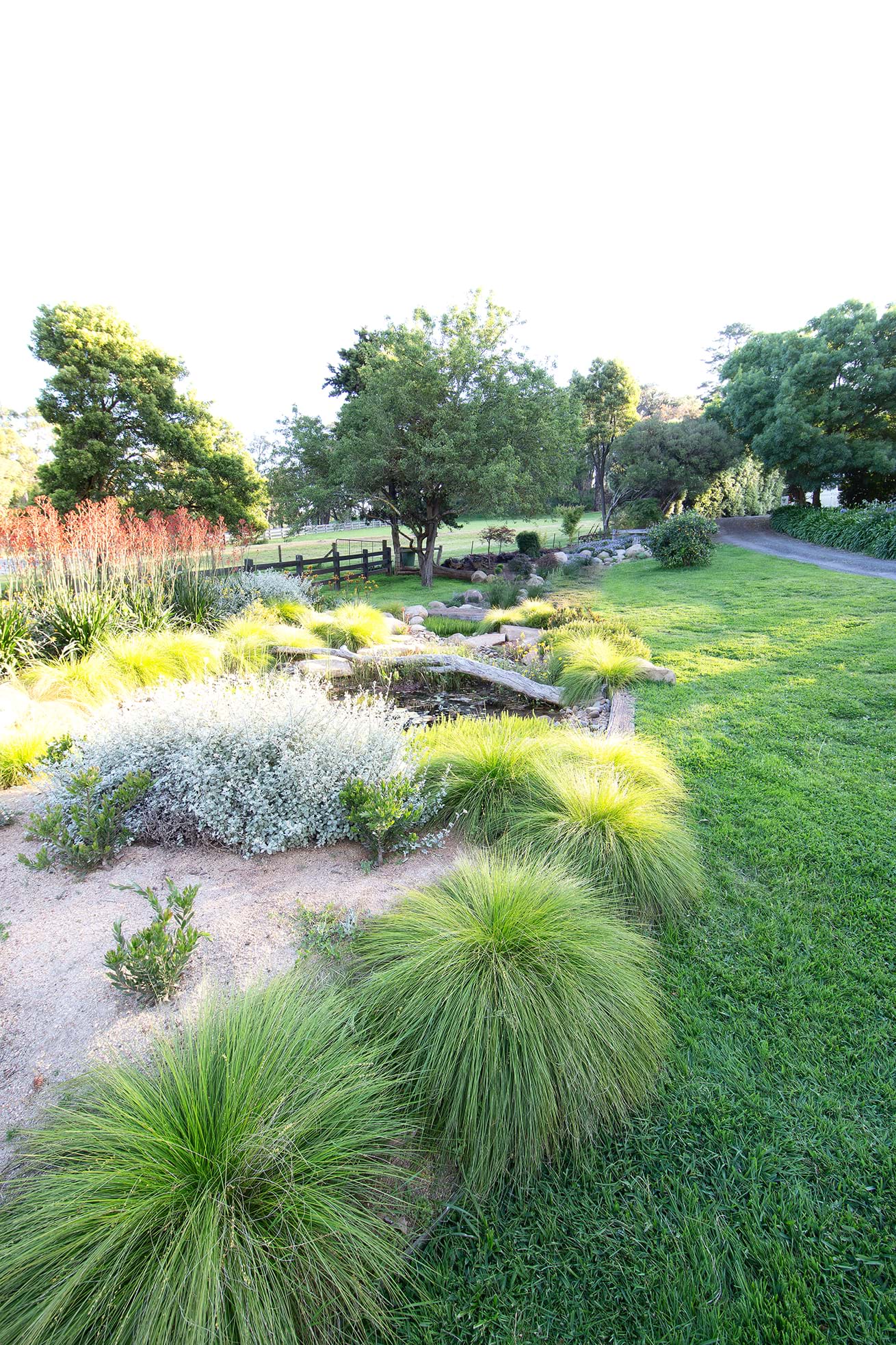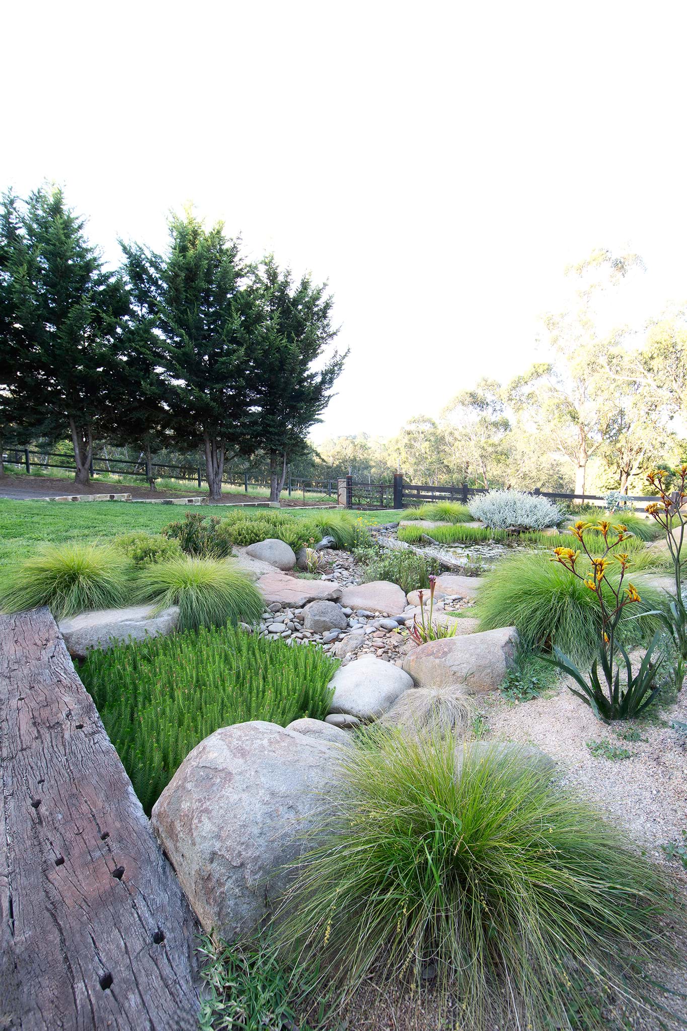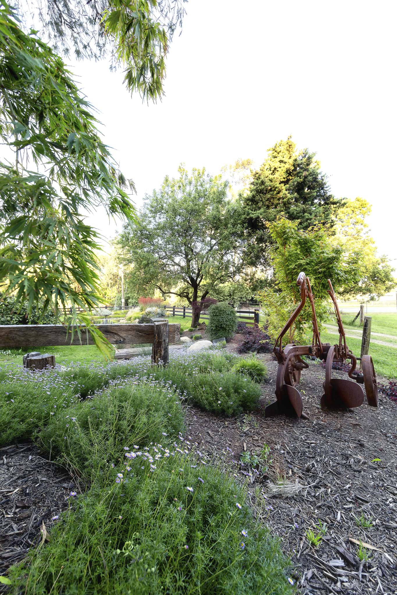 This one part of the garden is a natural flowing creek and billabong gathering water run off from the upper areas of the property and paddocks, the water flows down through the creek filled with semi aquatic plants that look ascetically pleasing, provide a natural area for habitat as well as filter and clean the water. Complete with recycled railway sleeper bridge, large rounded river pebbles, logs and aquatic plants the garden is a wonder view as you enter and exit the property. A popular water hole for local fauna attracting birds, frog’s dragon flyers and may other critters. The rustic garden art provides interest and focal points.