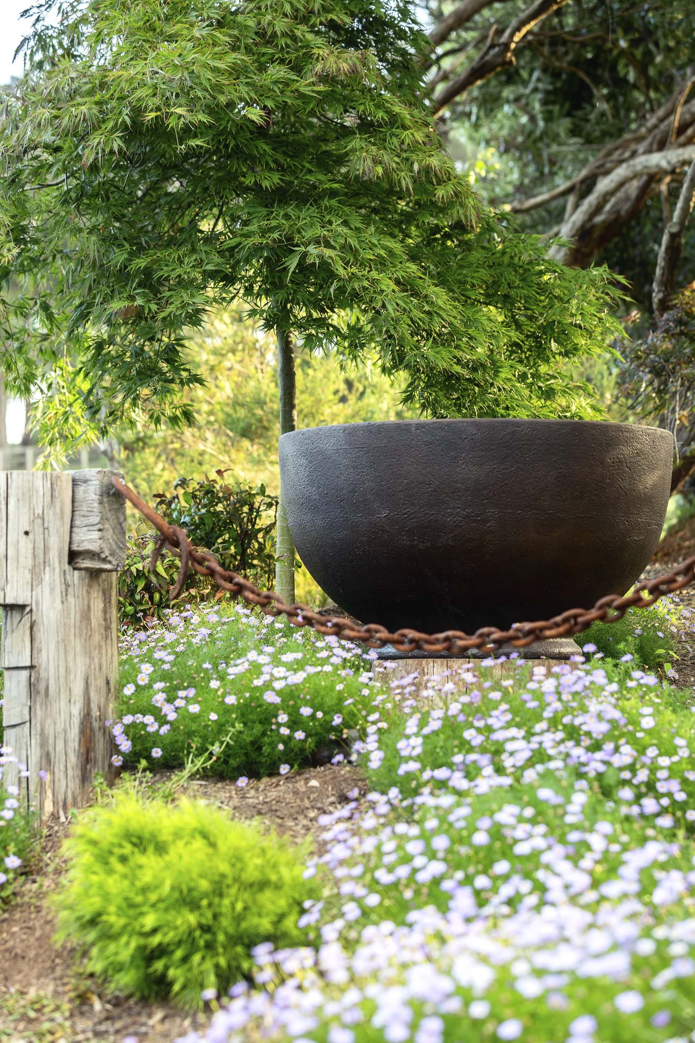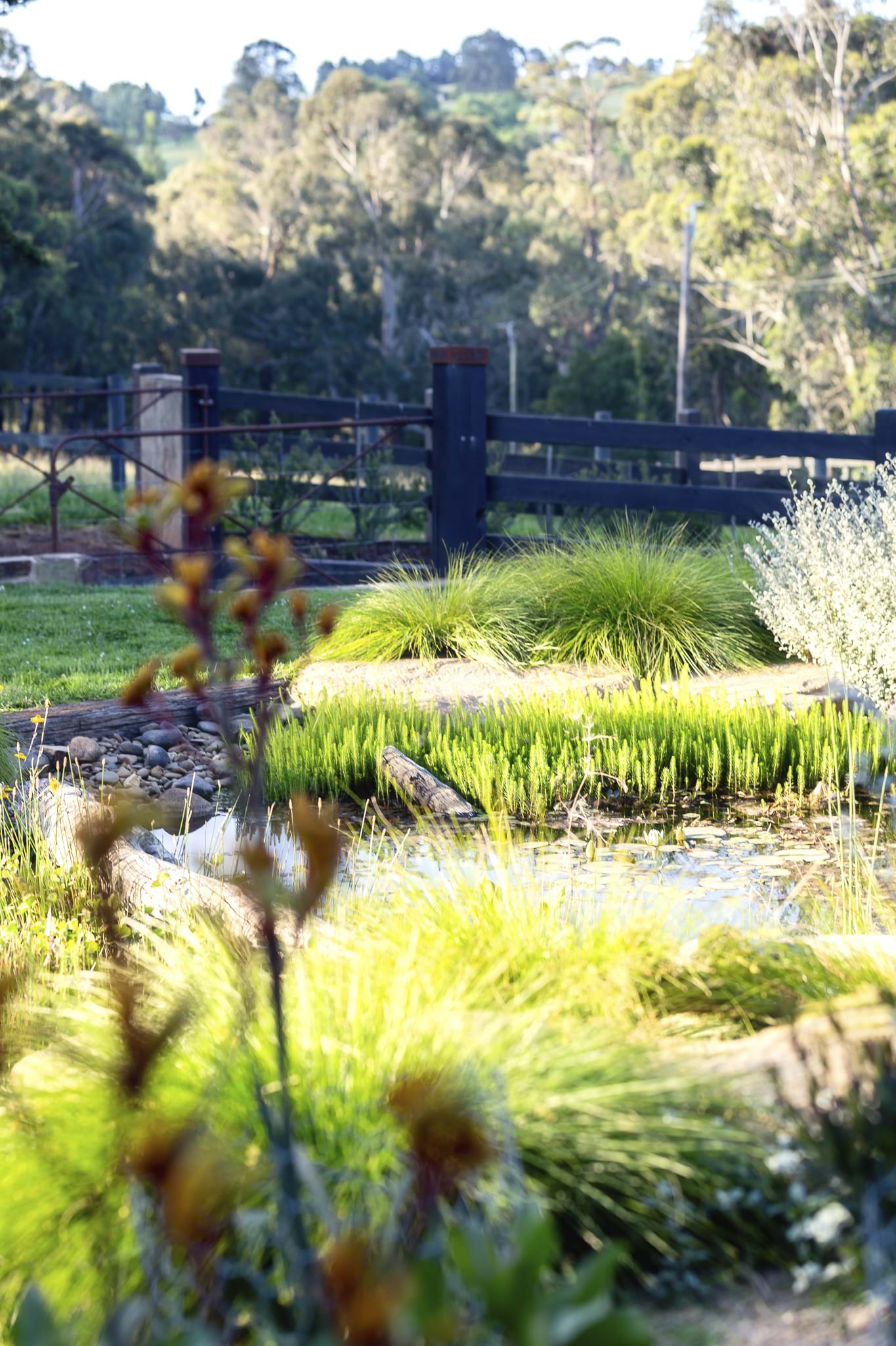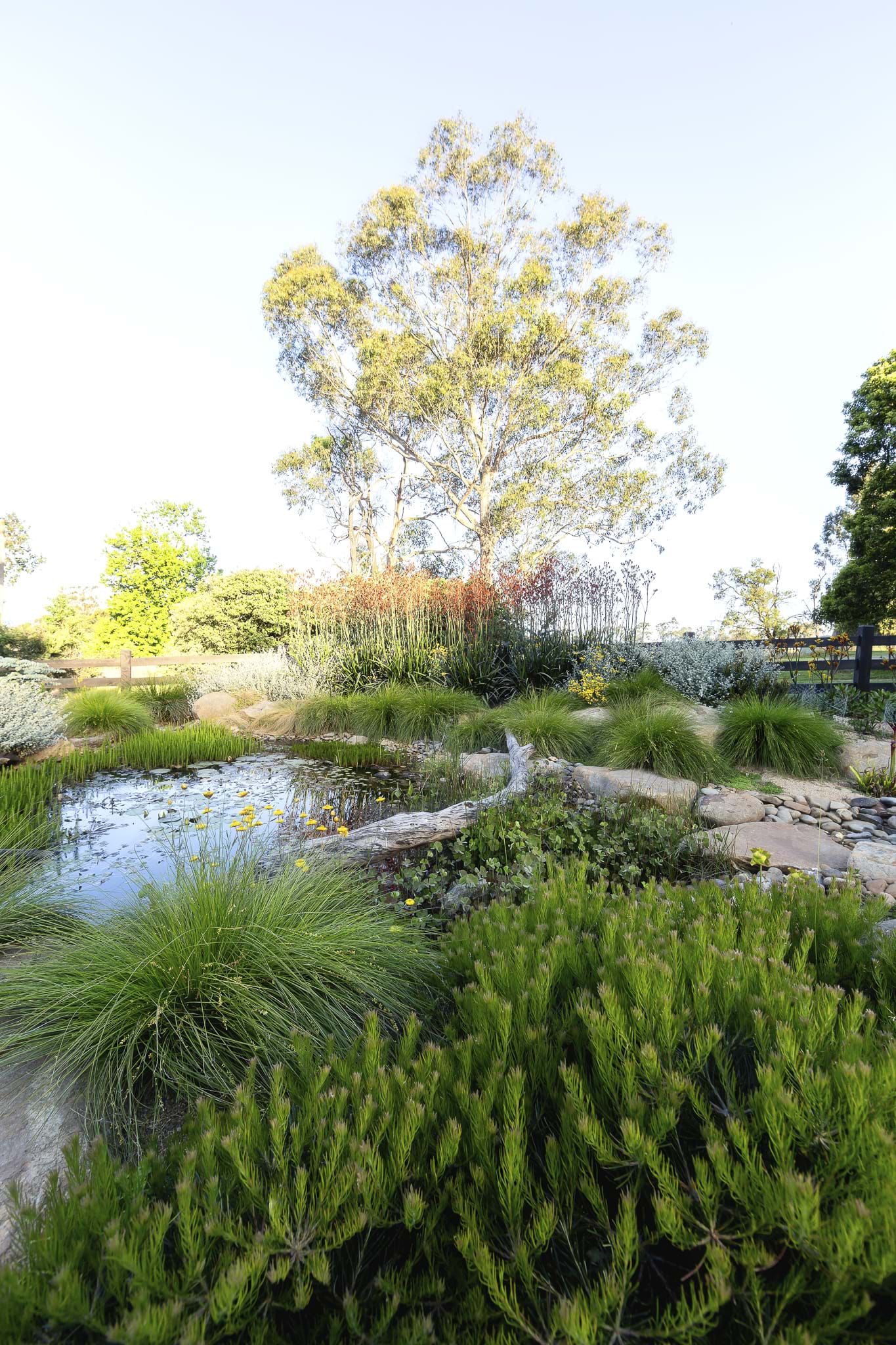 This one part of the garden is a natural flowing creek and billabong gathering water run off from the upper areas of the property and paddocks, the water flows down through the creek filled with semi aquatic plants that look ascetically pleasing, provide a natural area for habitat as well as filter and clean the water. Complete with recycled railway sleeper bridge, large rounded river pebbles, logs and aquatic plants the garden is a wonder view as you enter and exit the property. A popular water hole for local fauna attracting birds, frog’s dragon flyers and may other critters. The rustic garden art provides interest and focal points.