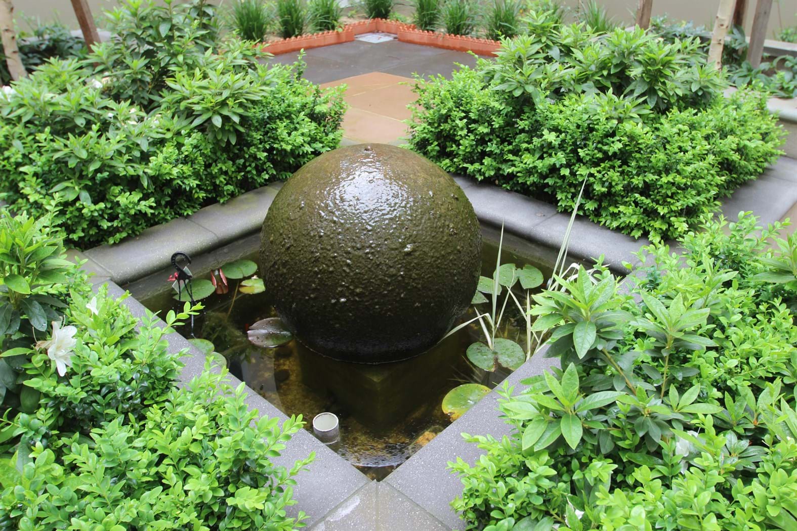 A formal garden is created with fragrant and colorful plants. Large trees for autumn color tonnings and summer shade with quite seating areas gives the residents a tranquil setting to enjoy.