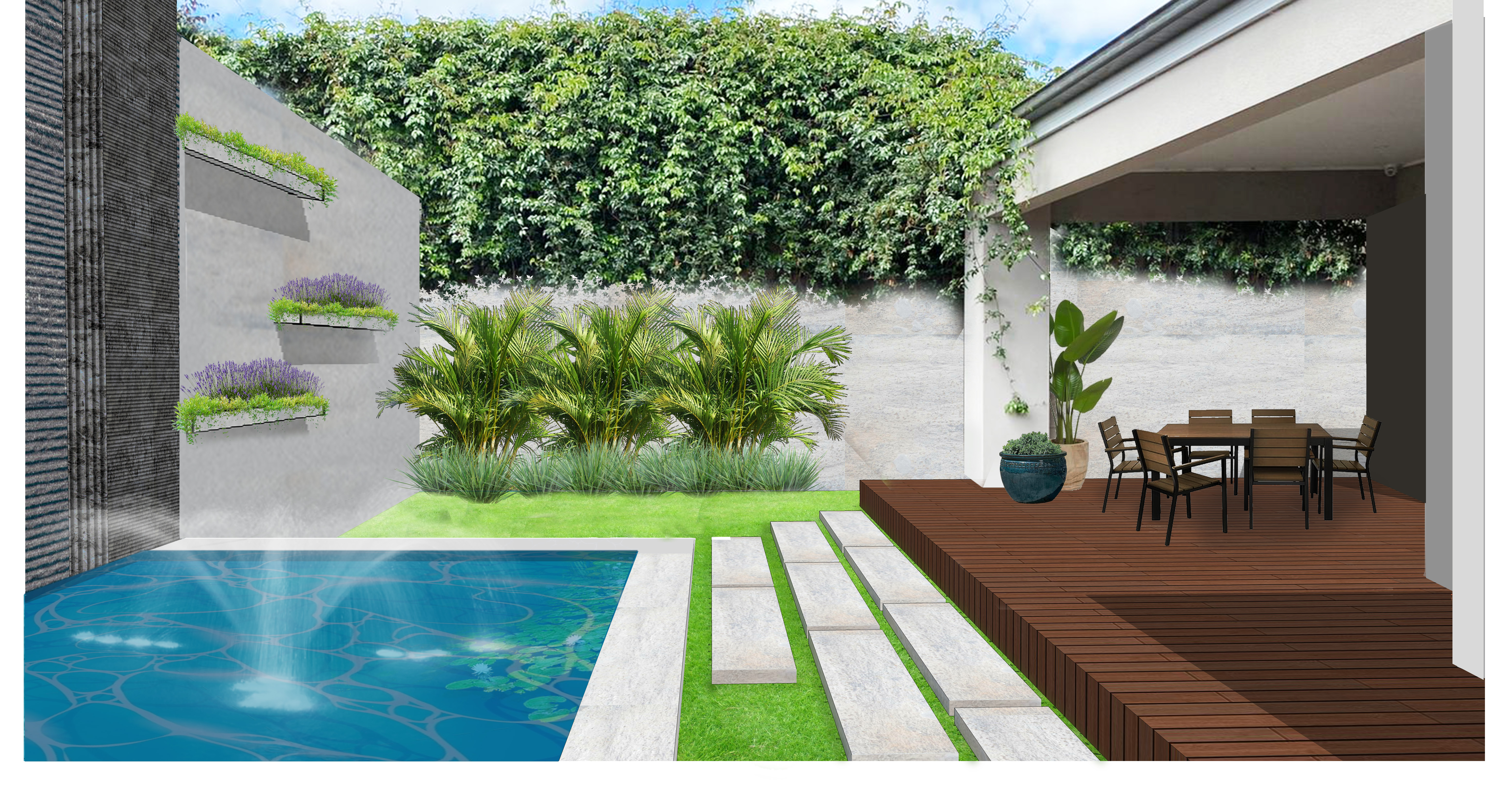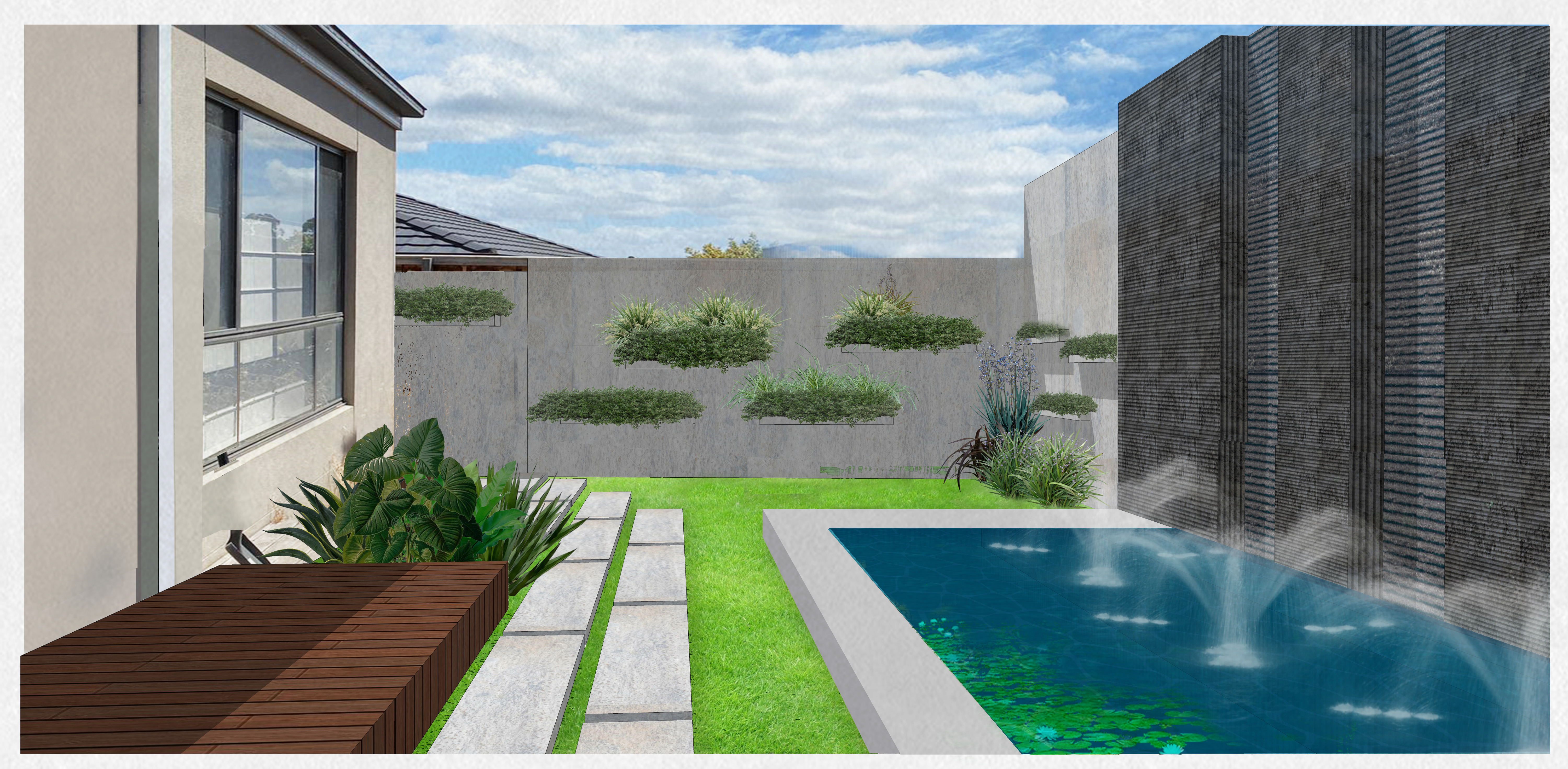 Our clients brief was to create a water garden that integrates within the rear yard. To give the sound of running water, provide a haven for fish and aquatic plants and provide feature panelling and green life screening to the rear concrete retaining walls and paling fences that will form an aseptically pleasing back to the garden. A lush green planting palette with a tropical feel. Access pathway system to the side of the house.