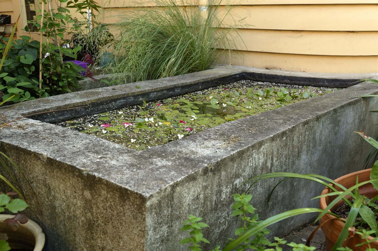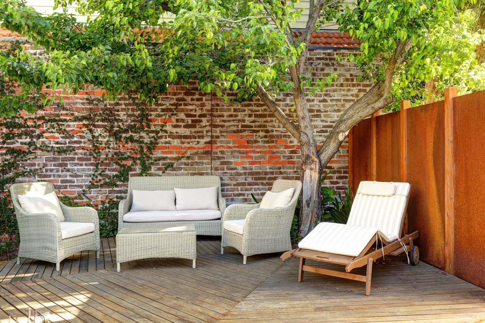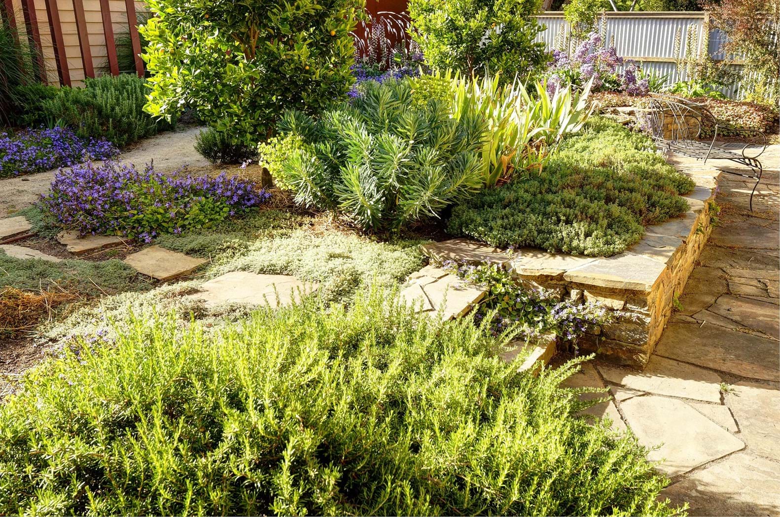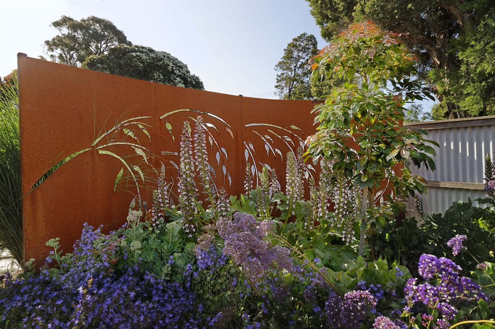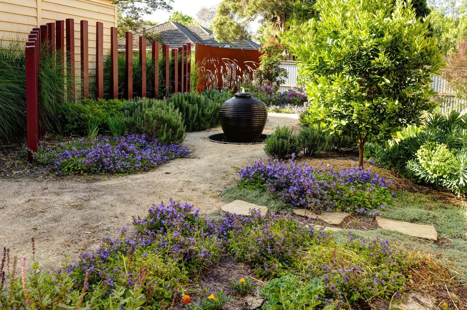 This design is a gardener’s garden complete with herb vegetatable patches , citrus trees and an abundance of colorful perennials. Garden art pieces provide visual appeal and also compliment rustic coreten steel panels.
