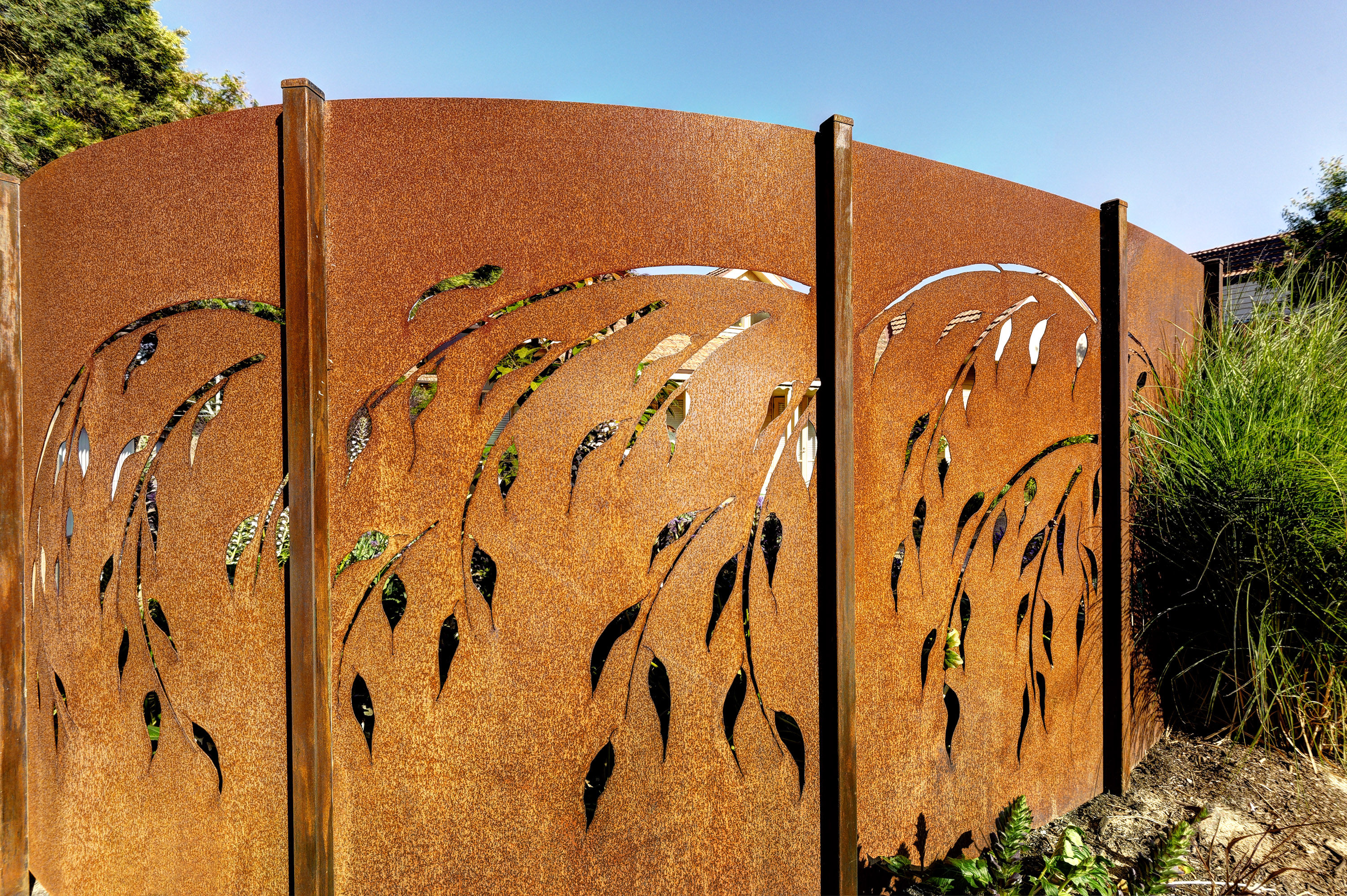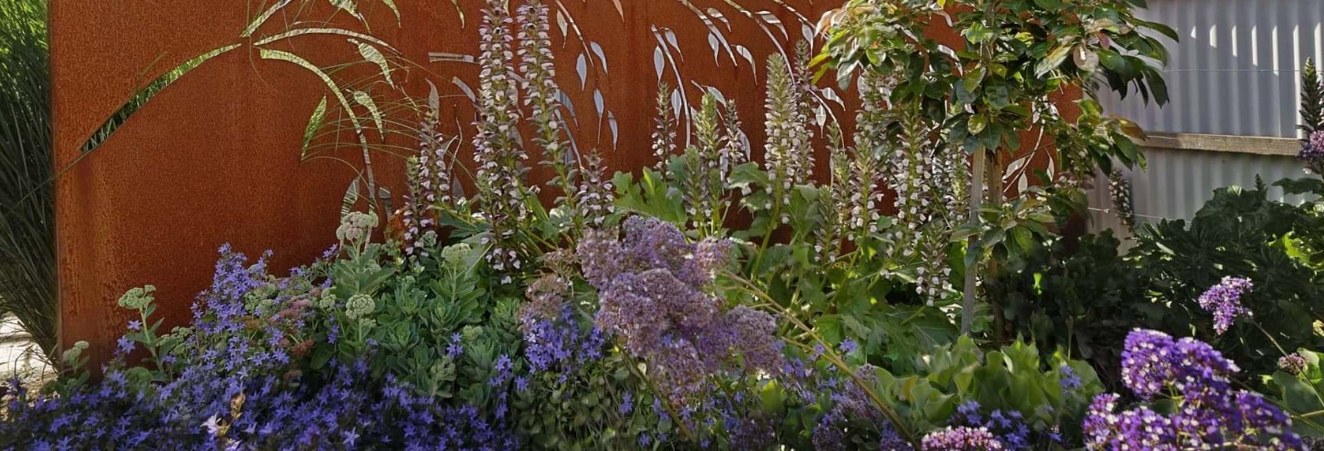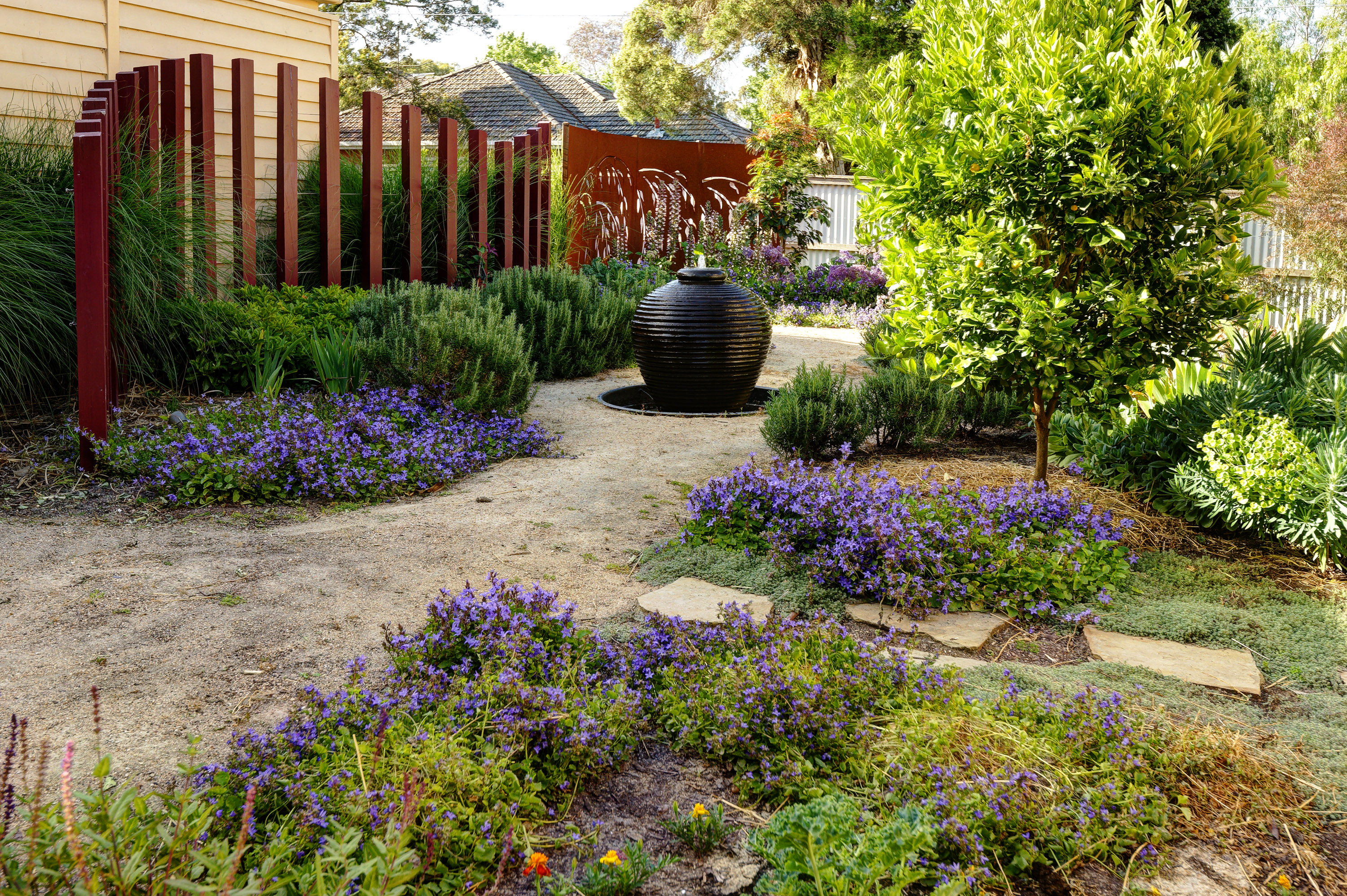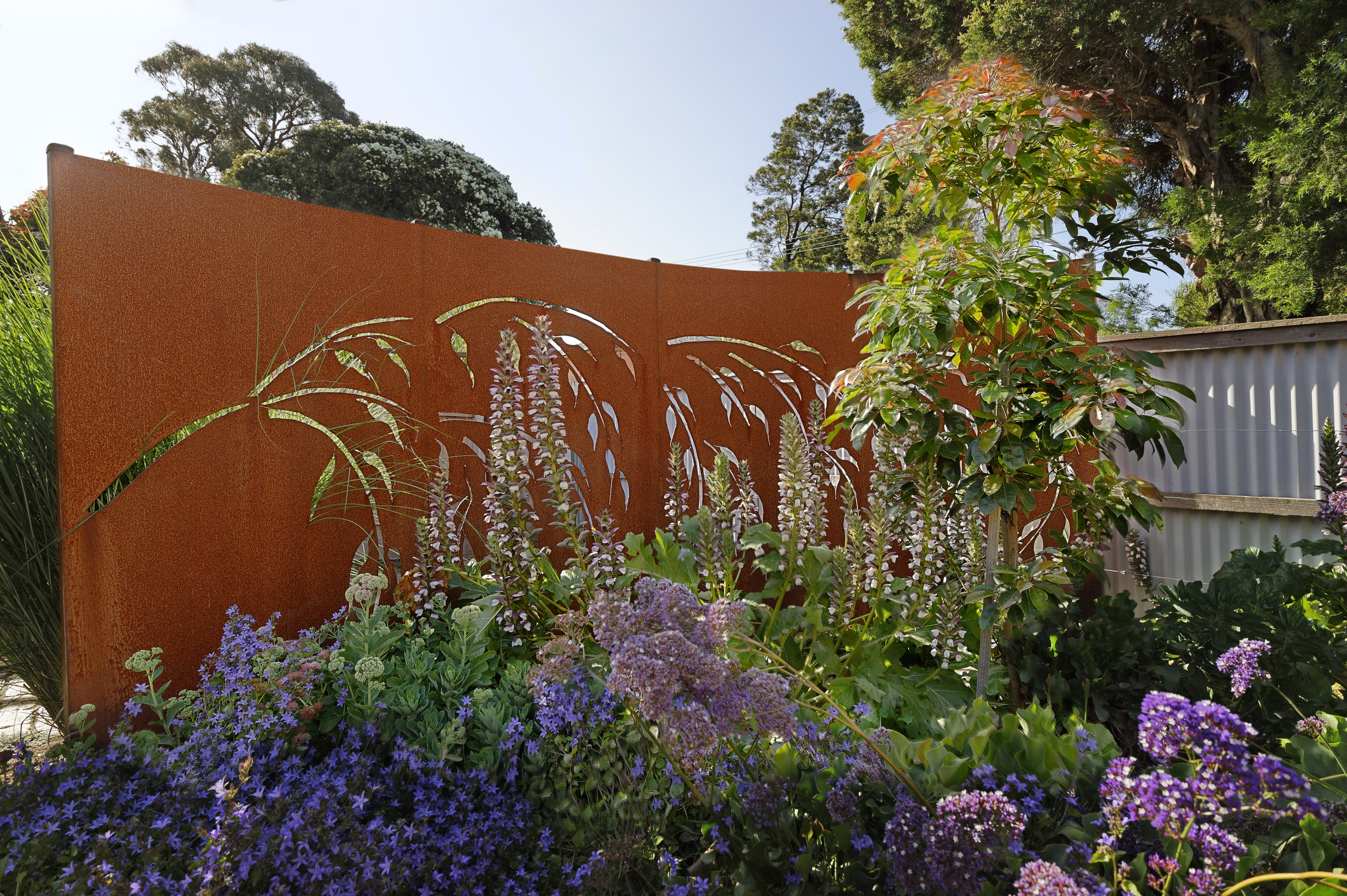 This design is a gardener’s garden complete with herb vegetable patches , citrus trees and an abundance of colorful perennials. Garden art pieces provide visual appeal and also compliment rustic coreten steel panels.