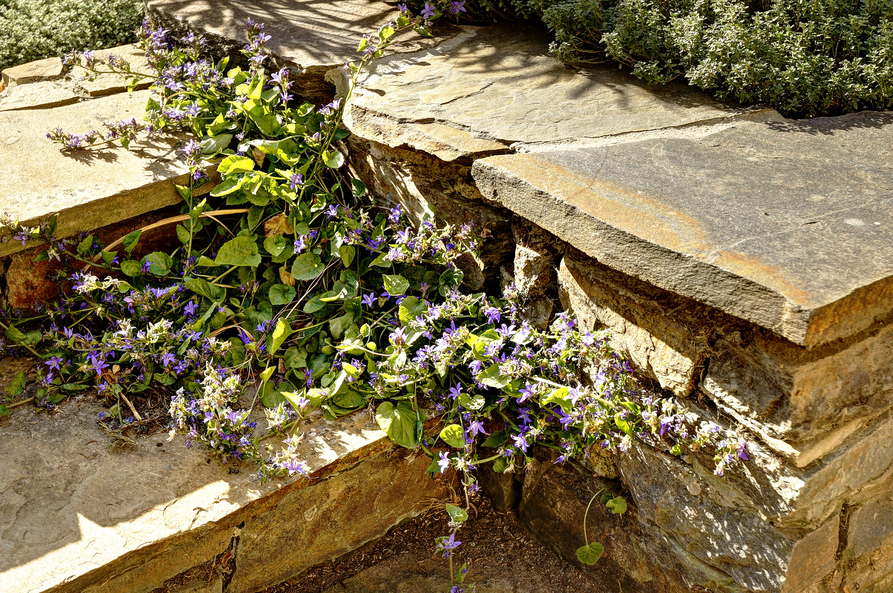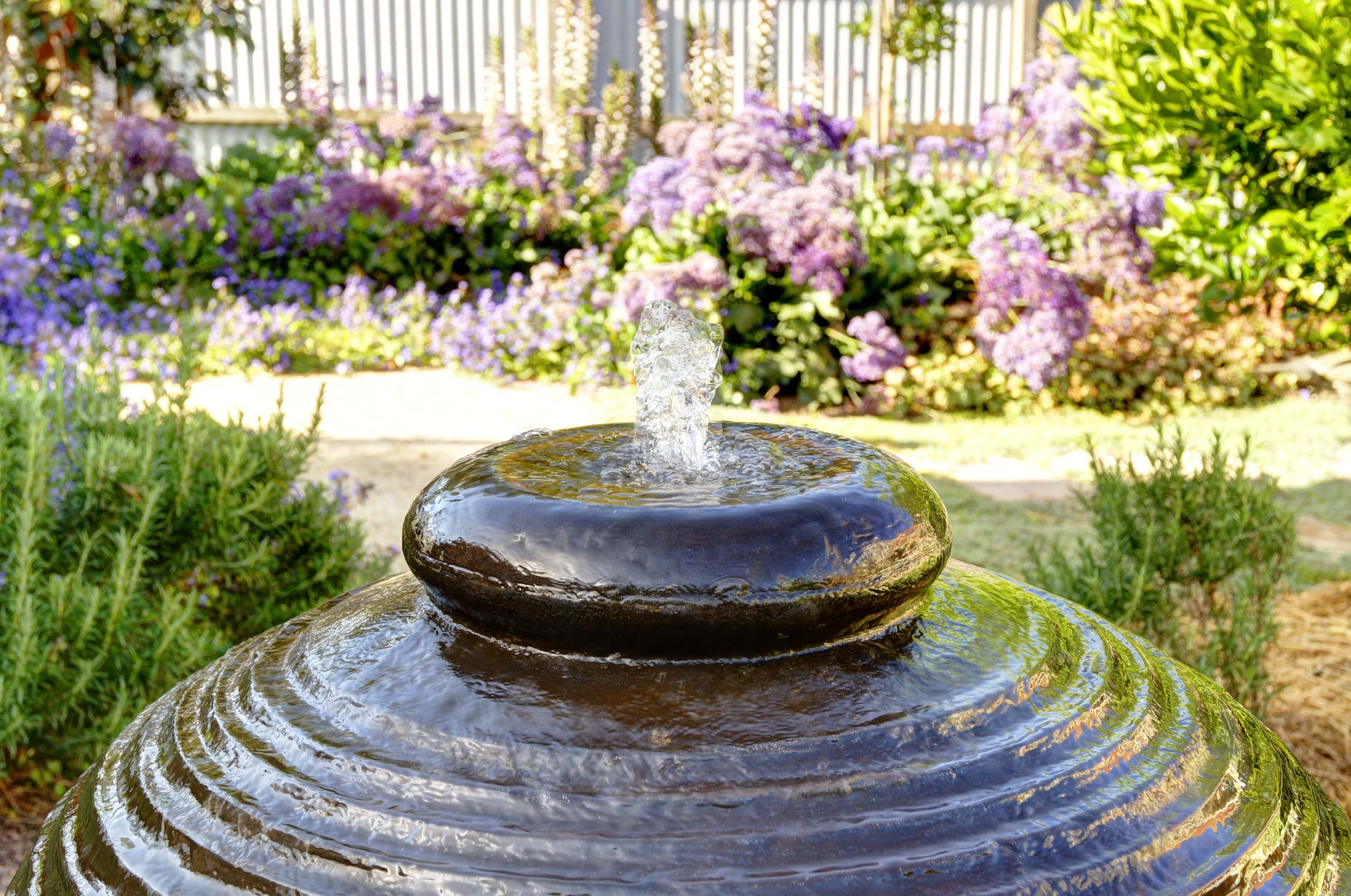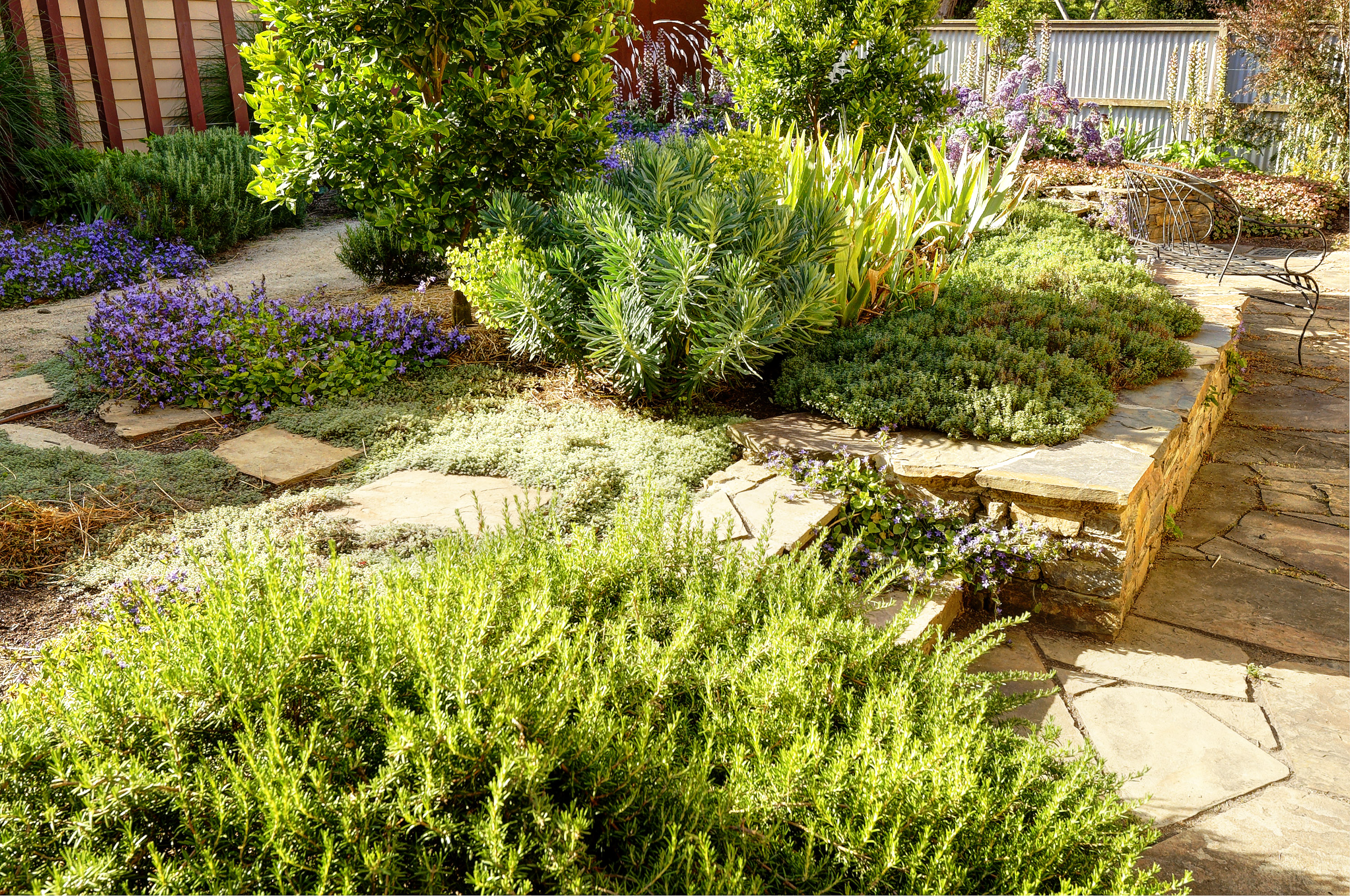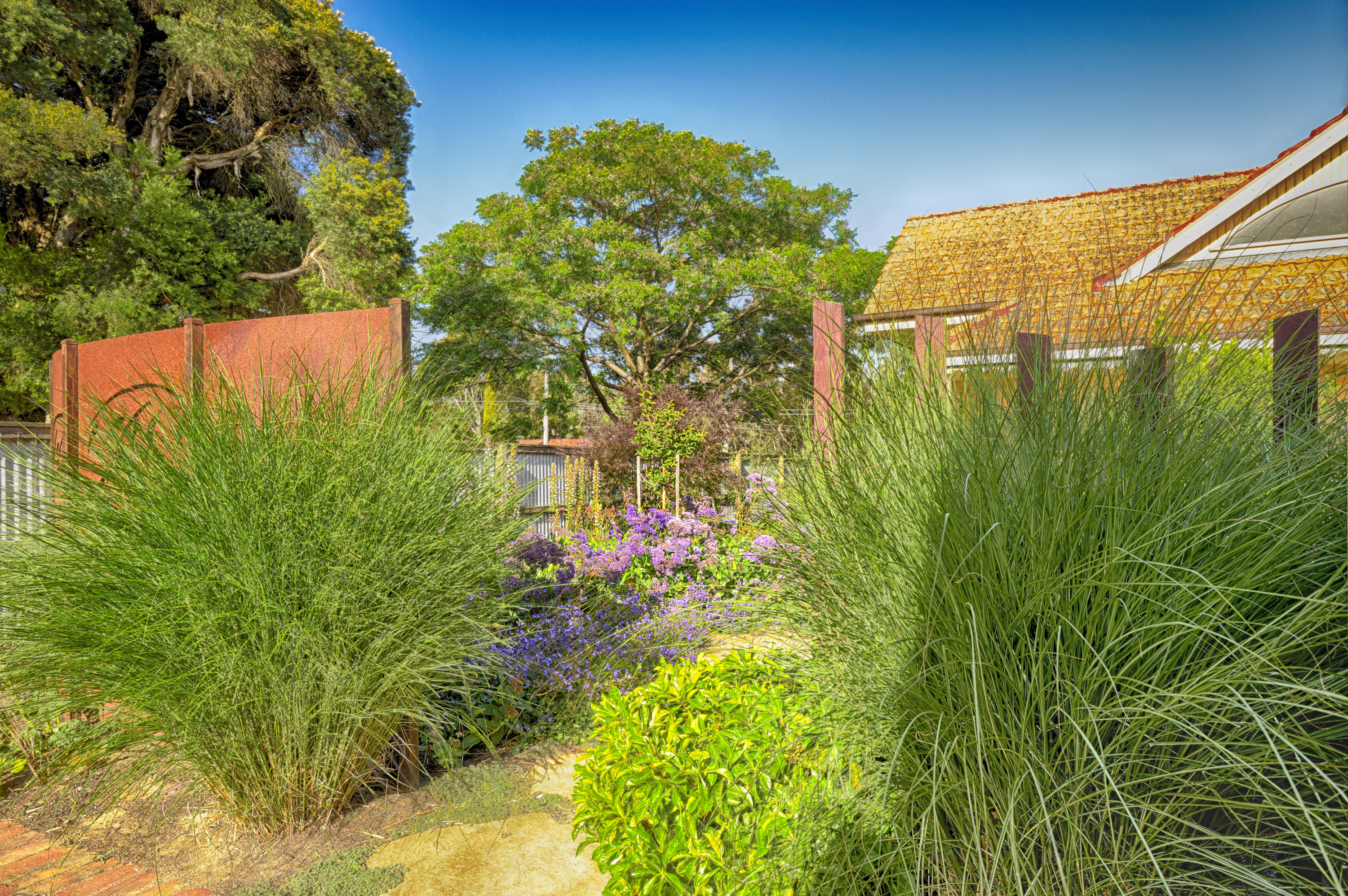 This design is a gardener’s garden complete with herb vegetable patches , citrus trees and an abundance of colorful perennials. Garden art pieces provide visual appeal and also compliment rustic coreten steel panels.