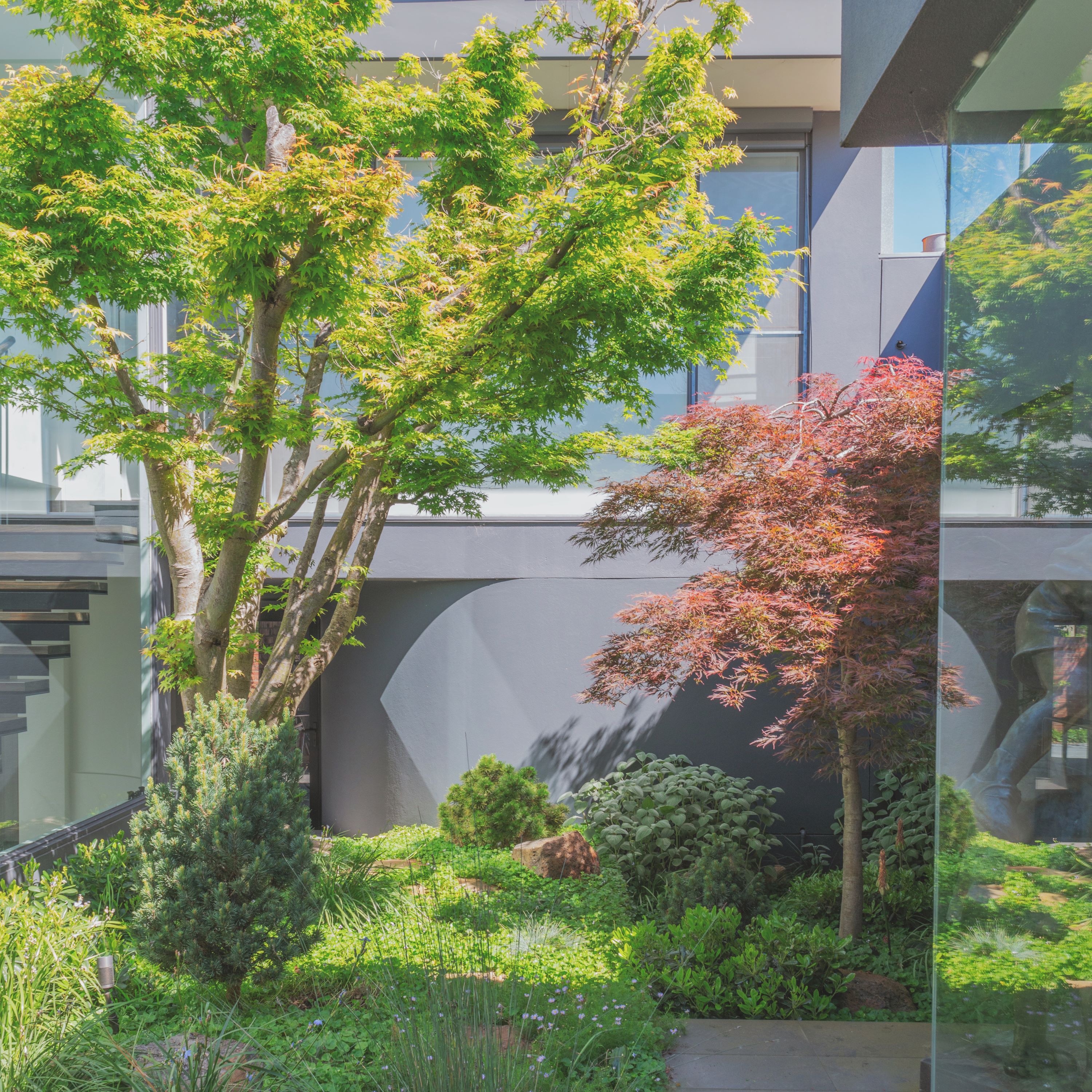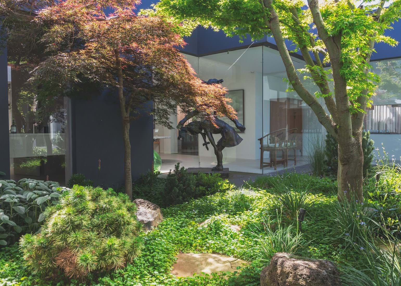 The internal courtyard flanked on three sides by wall-to-ceiling glass, providing spacious views from the kitchen and access hallways. There is a front entry into the courtyard garden, which features a pond filled with aquatic plants, a world-renowned sculpture by Brom, and Japanese-inspired plantings and stonework. A tranquil ambiance is created at night through strategically placed garden lighting.