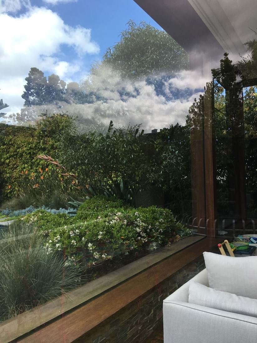 With this bold organic planting style and formal layout this garden certainly brings the outside in. The large windows create a continuous garden and pool theme as if looking into a mirror.