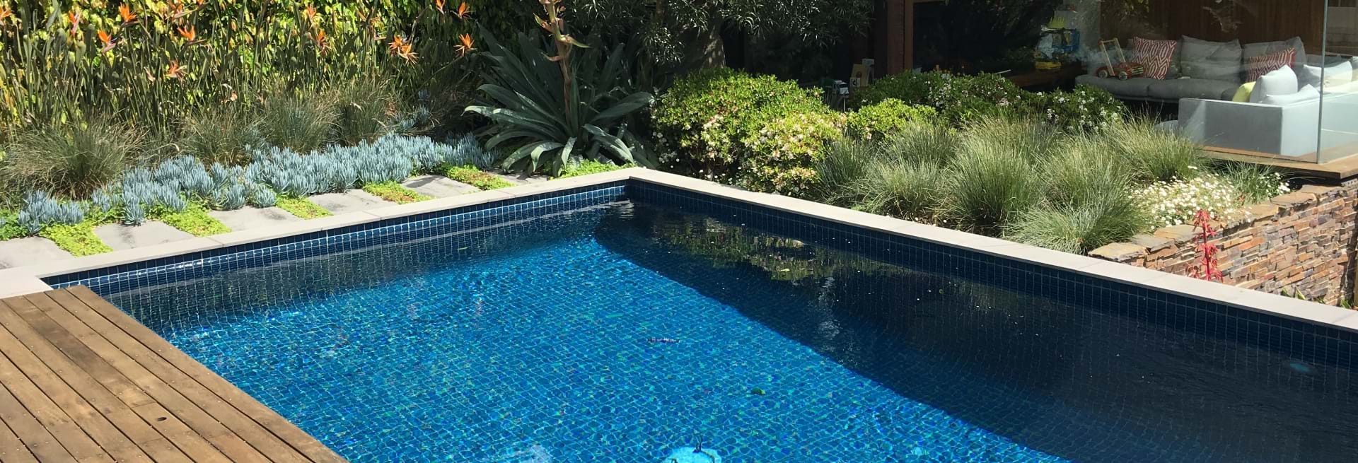 With a combination of glass, stone and timber material palette works well with the bold and hardy succulent and exotic planting palette. With striking orange and red flowers of architectural design within themselves. The contemporary outhouse is great for storage and change room.
